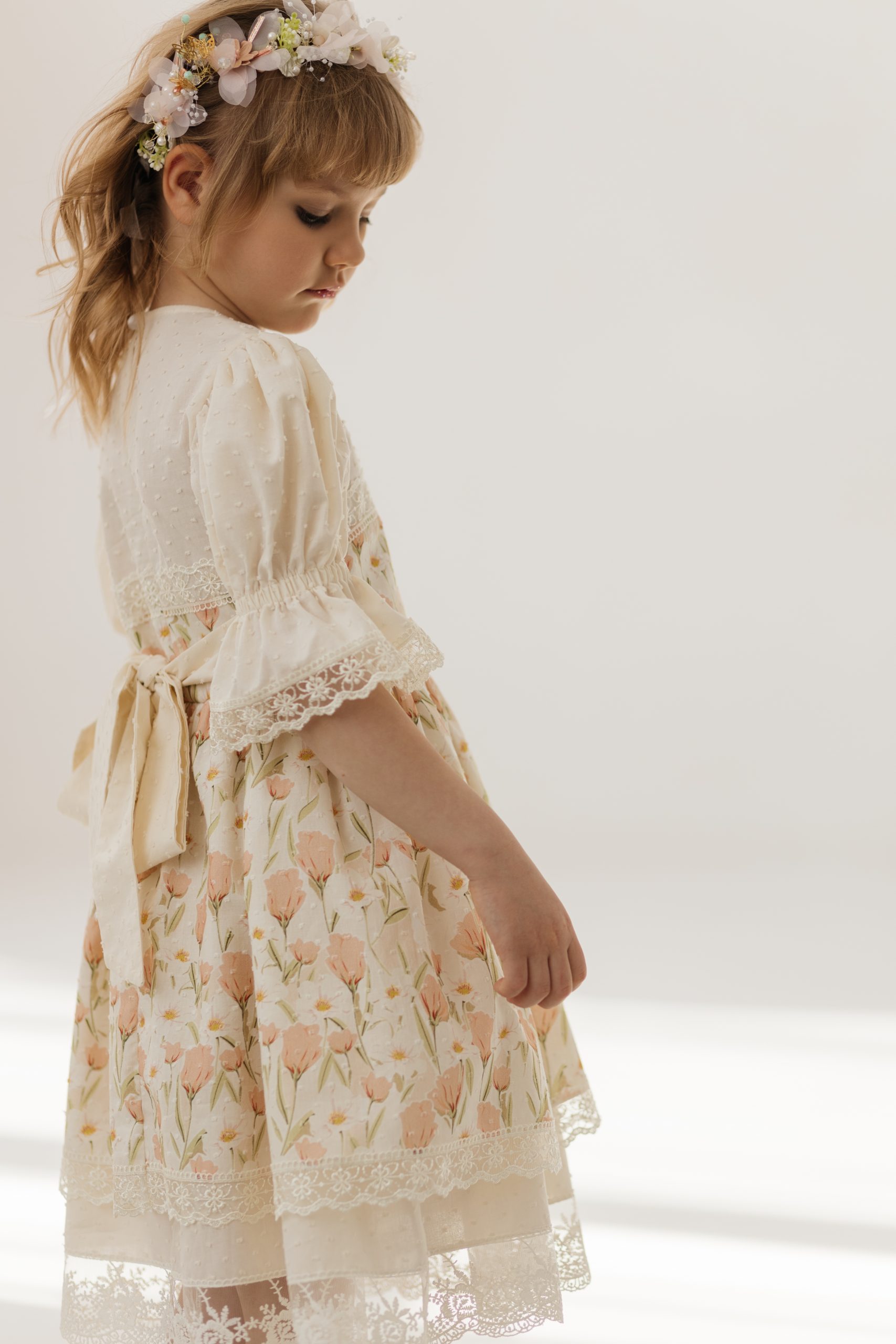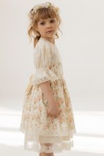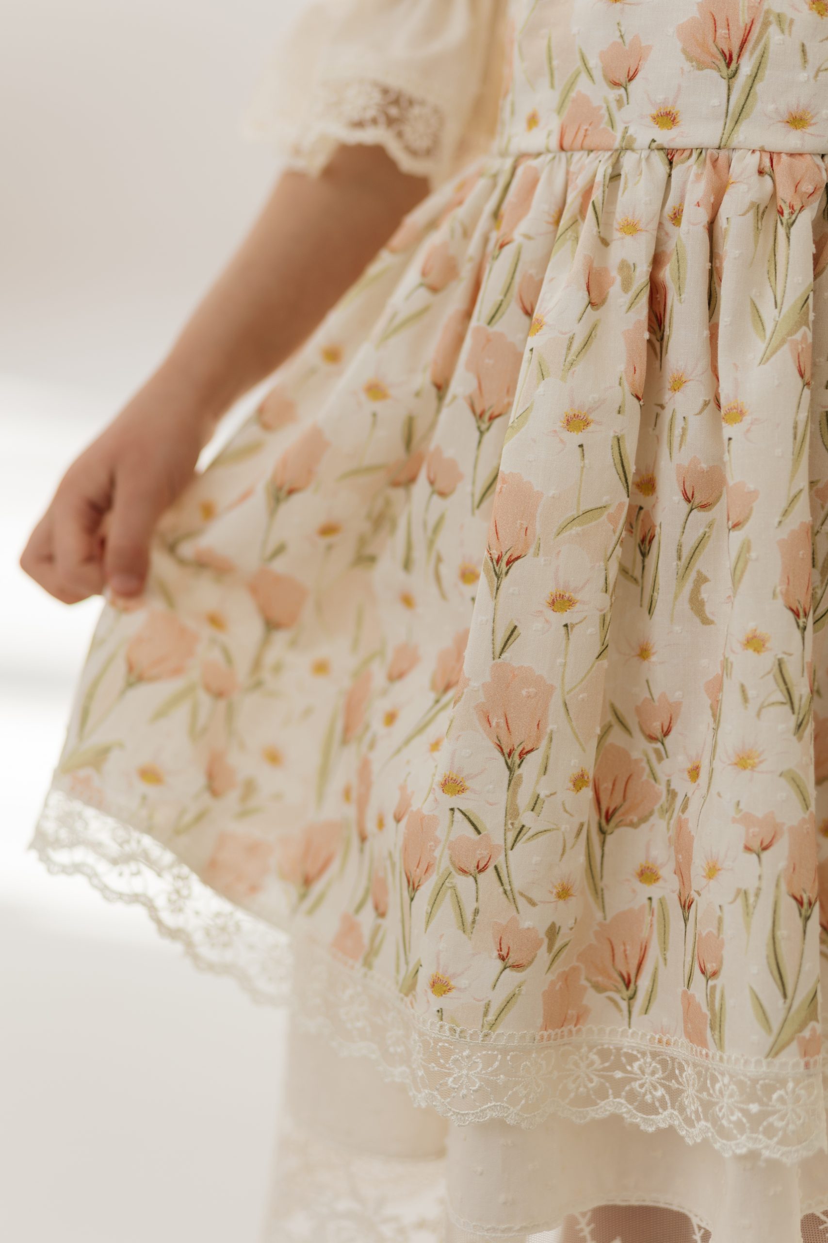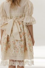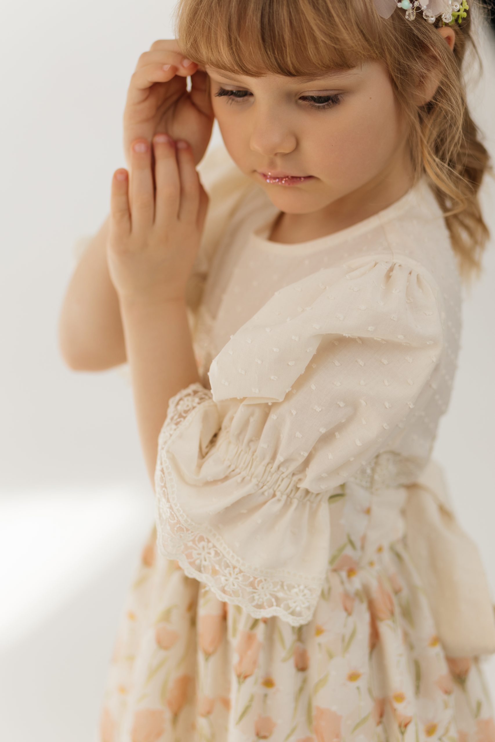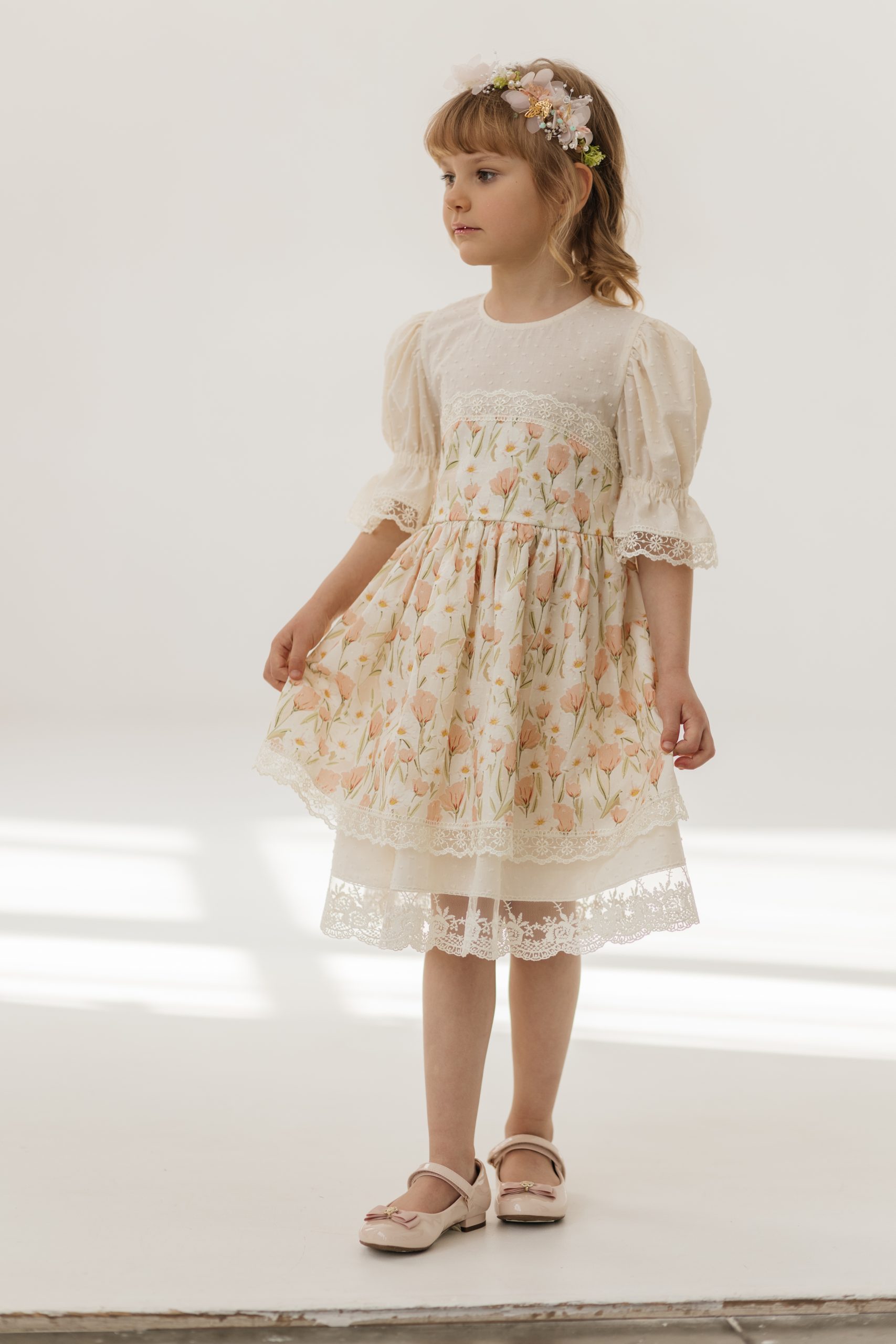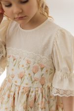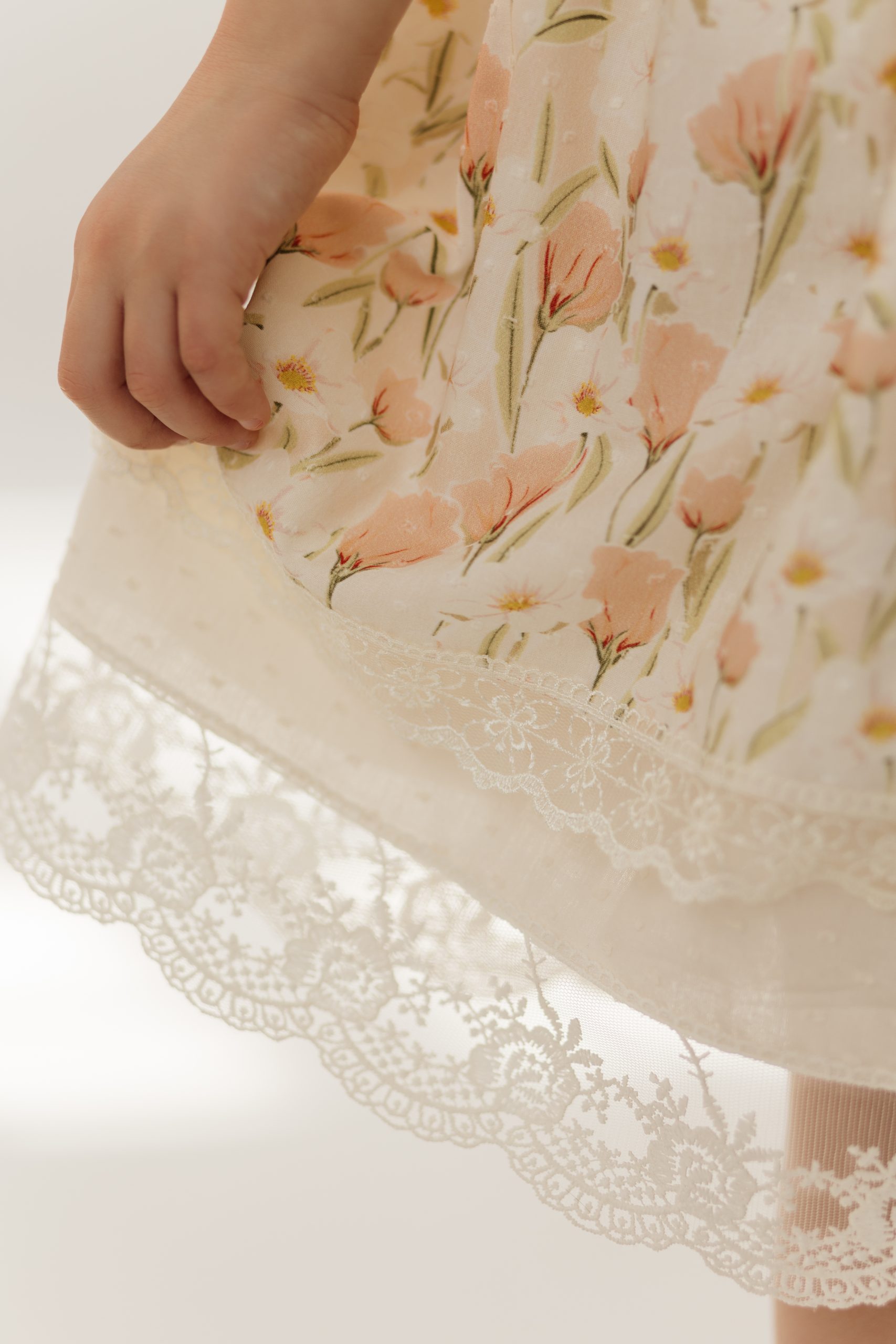 Роскошное платье для любого случая! Изысканный цветочный узор придает ему особый шарм, а объемные рукава-фонарики, украшенные тонким кружевом, добавляют романтичности. Удобный пояс в области талии позволит вам идеально подогнать лиф по фигуре. Лиф, выполненный из двух видов ткани и декорированный кружевом, выглядит особенно элегантно. Двухслойная юбка, также украшенная кружевом, гарантирует комфорт и полную непрозрачность. Это платье – воплощение стиля и утонченности, которое подойдет для самых разных событий!